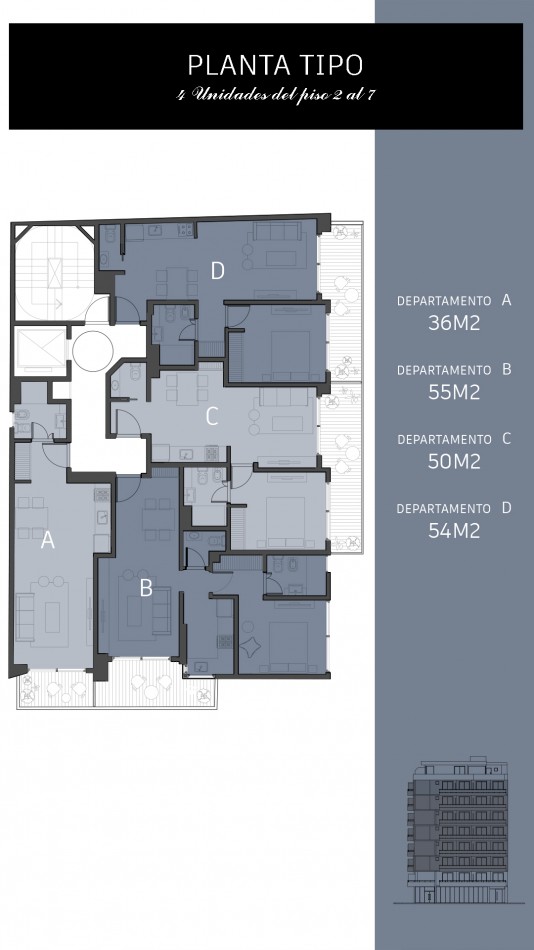 Departamentos de 2 ambientes: Amplios de hasta 56 m² con toilette y baño en suite.